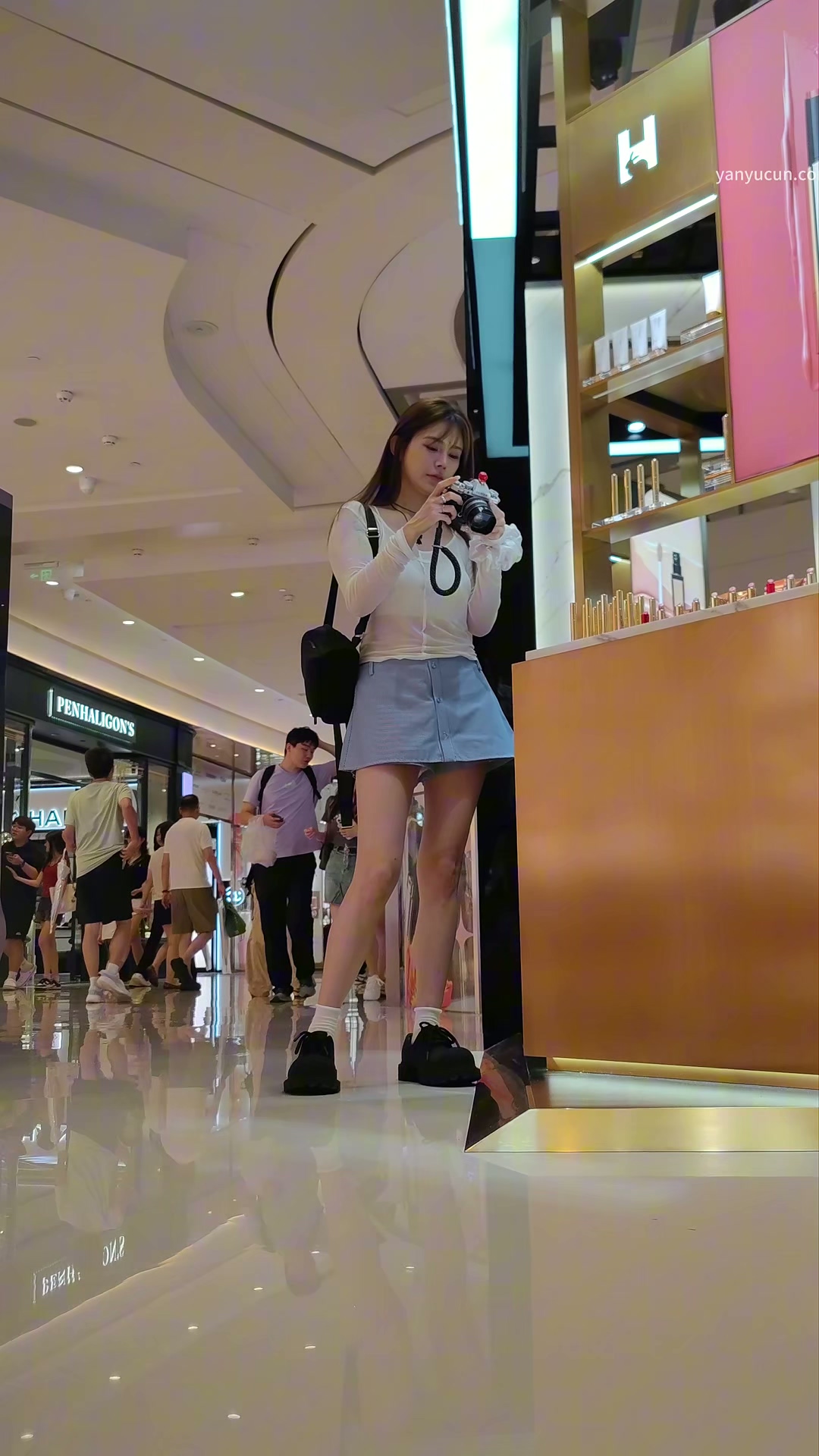 [CD单选] XM306蓝色裤裙美女商场一边走路一边拍照,白色内内
