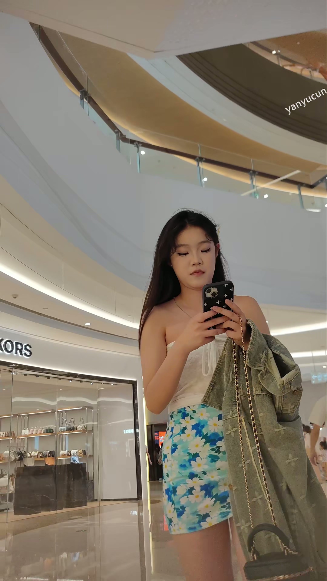XM364蓝色印花超短裙小姐姐和闺蜜逛街,白色内内